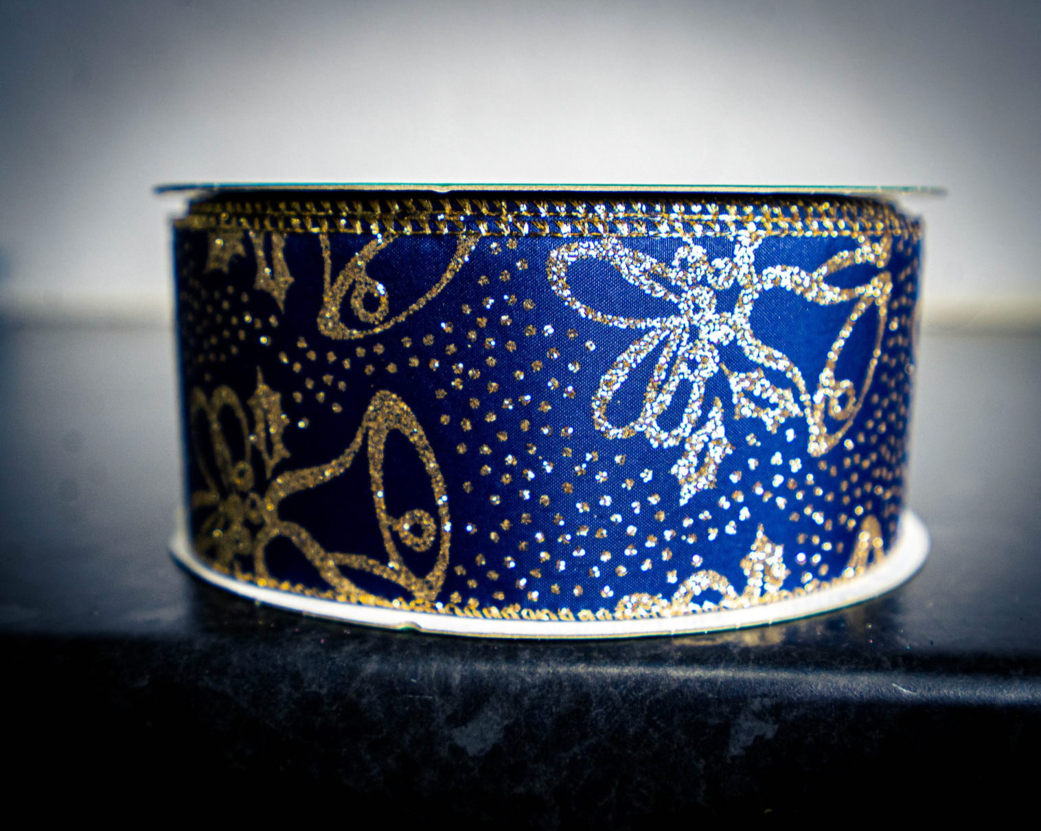 Gold and Navy Christmas Bell Ribbon
